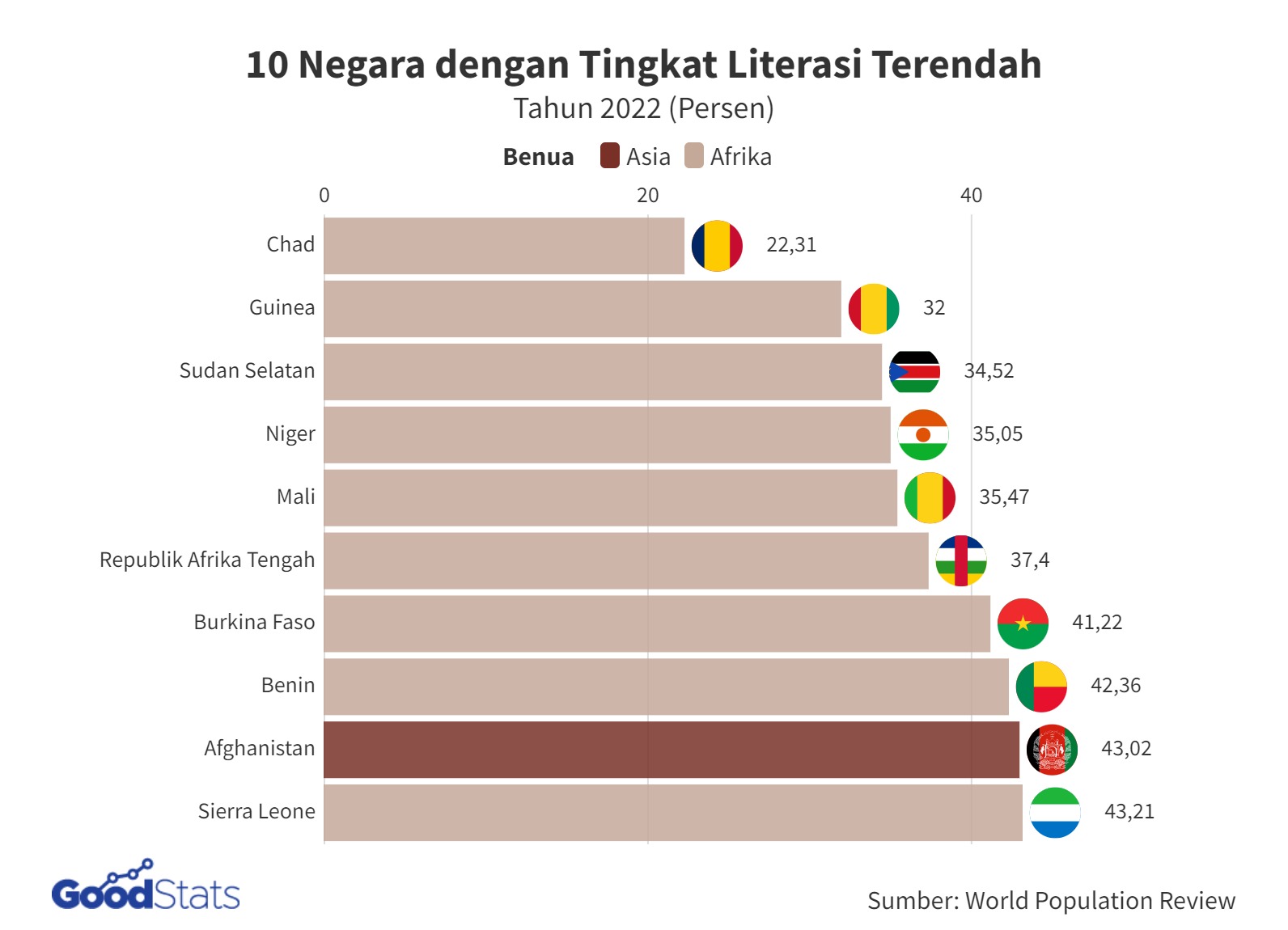 Ilustrasi mengenai negara-negara dengan tingkat literasi terendah.